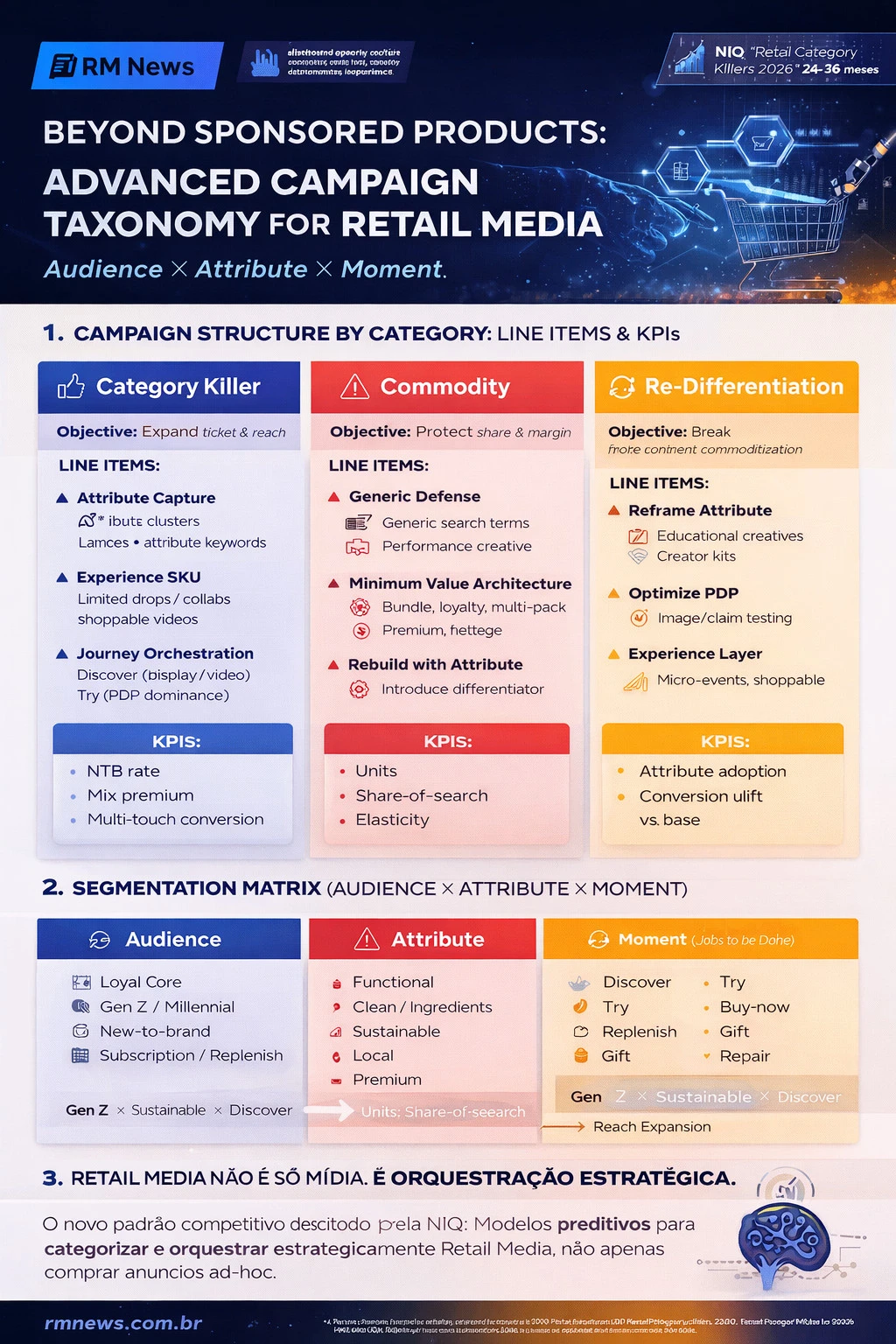 A NIQ prevê portfólios e sortimentos construídos por atributos priorizados pelo consumidor (clean, cruelty-free, embalagem sustentável, benefícios funcionais etc.), e recomenda auditar atributos por categoria e cohort. Qual é o nosso playbook em Retail Media: estruturar campanhas por cluster de atributos (não por “linha de produto”); Keywords e criativos com claim hierarchy (atributo principal → prova → benefício); segmentação por cohort (Gen Z X Core) com criativos diferentes.