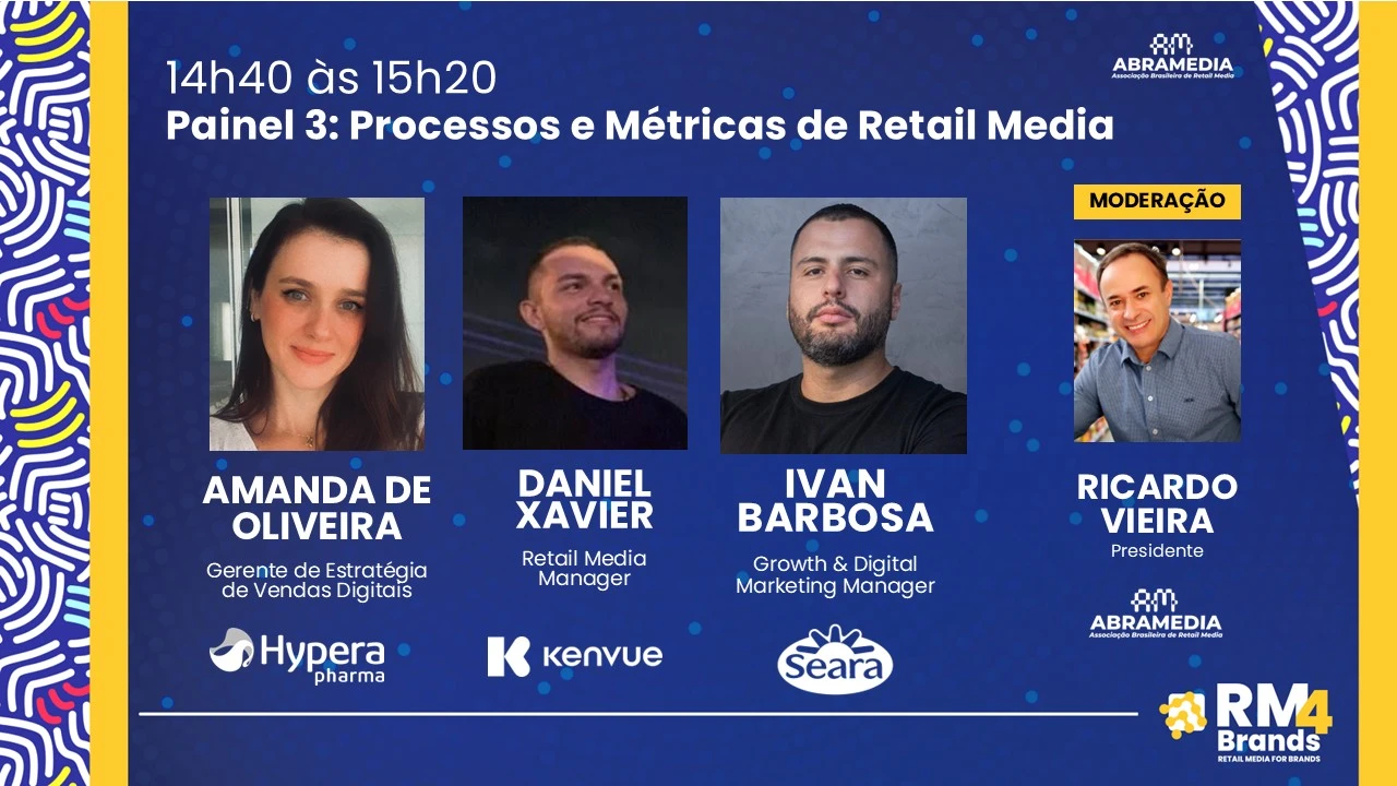 O terceiro painel do RM4Brands, realizado pela ABRAMEDIA na FIA Business School, reuniu três executivos que representam o novo mindset de integração entre dados, performance e governança: Amanda de Oliveira (Hypera Pharma), Daniel Xavier (Kenvue) e Ivan Barbosa (Seara). Mediado por Ricardo Vieira (Abramedia) o painel abordou o tema “Processos e Métricas em Retail Media: o próximo passo da indústria”, mergulhando nas dores estruturais e metodológicas que ainda limitam o avanço do ecossistema brasileiro.