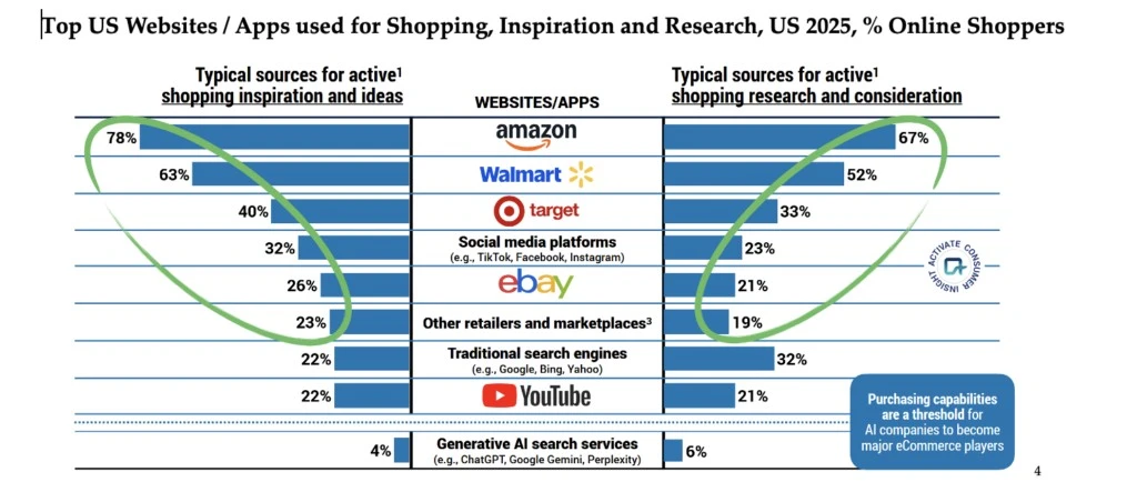Amazon e Walmart dominam tanto a inspiração de compras quanto a intenção de compra nos EUA. As plataformas sociais influenciam a descoberta, mas ficam atrás na conversão, enquanto a IA generativa ainda está em fase inicial.