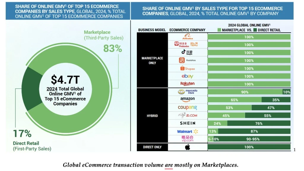 O volume global de mercadorias no comércio eletrônico é dominado por dez empresas. Dois terços do volume global de transações de comércio eletrônico estão concentrados em seis empresas. Que tipo de negócios são esses? Marketplaces. Podemos afirmar com segurança que o comércio eletrônico é, em sua maior parte, um negócio de marketplaces, com vendedores terceirizados gerando 83% do GMV online para os 15 maiores players do setor.