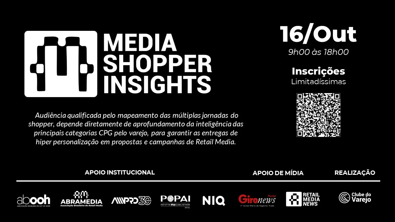 O Clube do Varejo, em parceria com importantes instituições do setor, apresenta o MEDIA SHOPPER INSIGHTS 2024, um evento inédito, estratégico e técnico de Shopper Marketing totalmente focado em Retail Media. O evento acontecerá no dia 16 de outubro na FIA Business School, em Pinheiros, em São Paulo (SP).